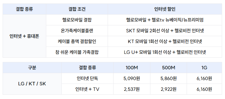 | 인터넷 | 미결합 | 26,510원 | 13만원+@ | 30,360원 | 18만원+@ | 31,900원 | 20만원+@ |