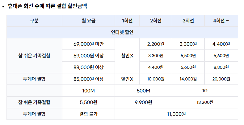 | 구분 | 인터넷 단독 | TV 단독 | 인터넷 + TV | TV추가 (1대 당) | 인터넷 전화 (인터넷과 동시 진행시) | 일반 전화 (인터넷과 동시 진행시) |