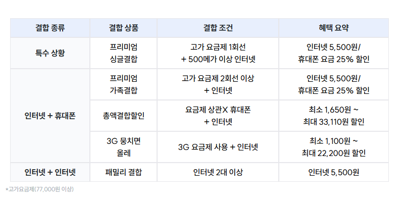 | 인터넷 | 미결합 | 22,000원 | 9만원+@ | 33,000원 | 14만원+@ | 38,500원 | 14만원+@ |