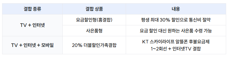 | 구분 | 인터넷 단독 | TV 단독 | 인터넷 + TV | TV추가 (1대 당) | 인터넷 전화 (인터넷과 동시 진행시) | 일반 전화 (인터넷과 동시 진행시) |
